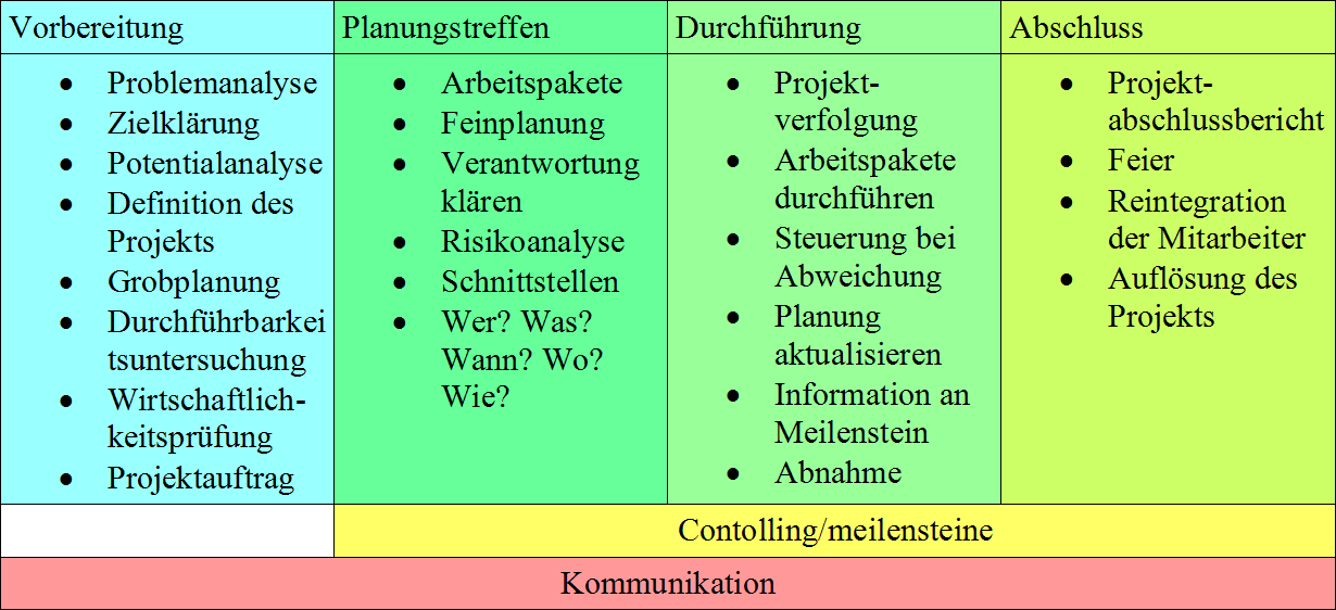 Anschließend geht es an die Planungstreffen, die definieren sollen, wer wann was wo erledigt. Außerdem muss man alles genau durchplanen, damit es keine Probleme in der Praxisphase gibt. Man muss sich auch im Klaren sein, welche Risiken es möglicherweise geben kann.