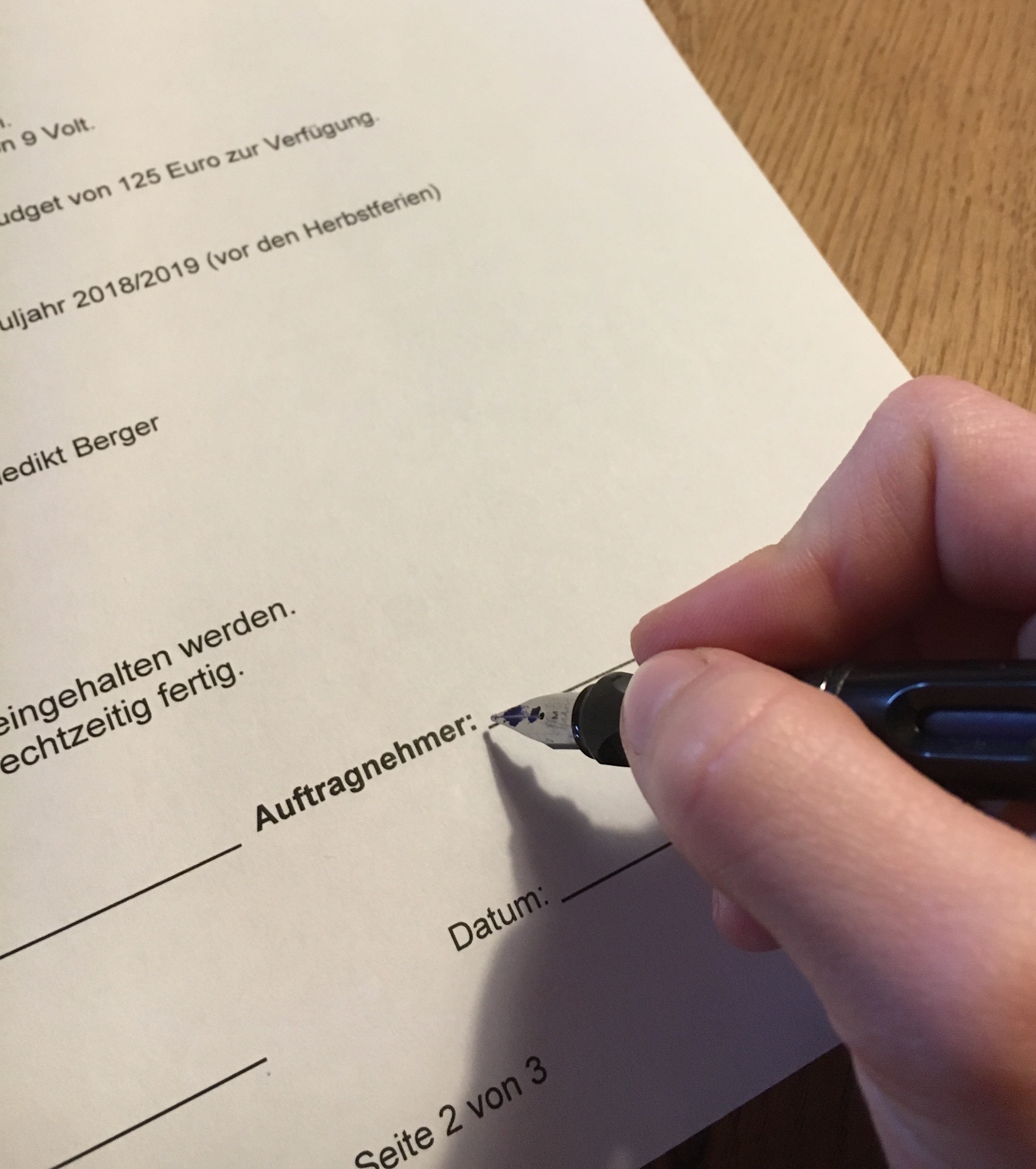 Und schon war die Theoriephase vorbei. Nun ging es an die Projektarbeit. Dazu wurden wir in 4 Gruppen zu je 4 Schülern eingeteilt, in denen wir einen Projektvertrag ausarbeiteten und diesen dann auch unterschrieben.